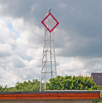 Der Sektorenscheinwerfer ist an einem weißen Stahlgittermast befestigt.