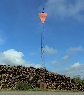 An einem dreischenkligen Stahlgittermast ist ein rot verlattetes Dreieck
